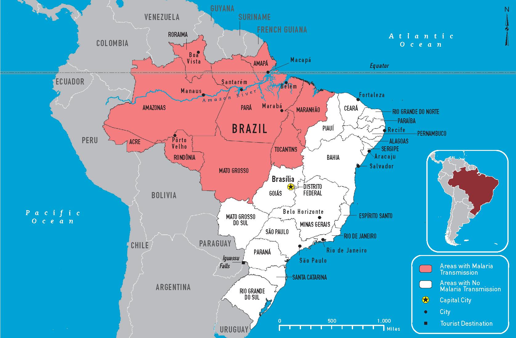 Prawie cała malaria w Brazylii występuje w dorzeczu Amazonki, choć komar-wektor jest obecny w dużej części kraju. Głównym gatunkiem malarii jest Plasmodium vivax, choć około 12% przypadków jest wywoływanych przez P. falciparum, jak podano na mapie malarii Brazylii. Profilaktyczne leczenie lekami przeciwmalarycznymi jest zalecane dla podróżnych udających się do obszarów endemicznych dla malarii.
