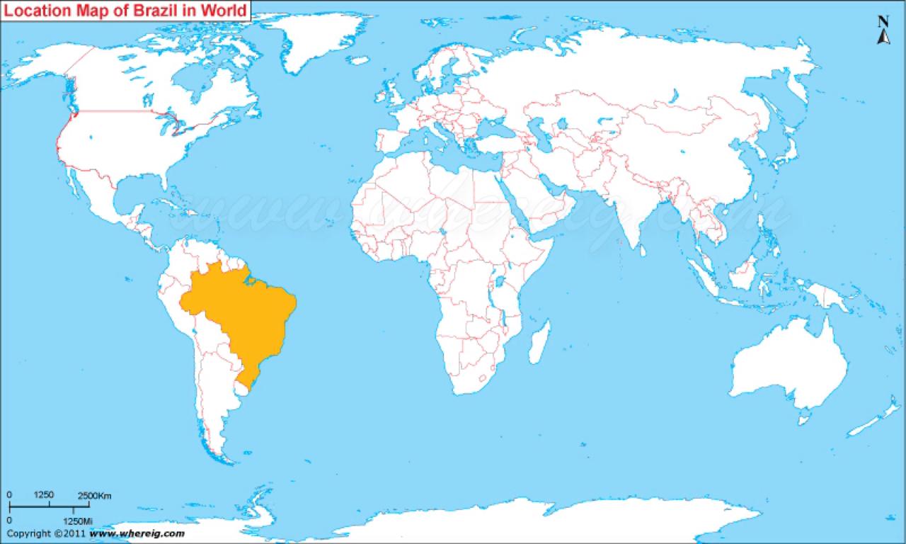 Lokalizacja Brazylii na mapie świata. Lokalizacja Brazylii na mapie świata (Ameryka Południowa - Ameryka) do druku. Lokalizacja Brazylii na mapie świata (Ameryki Południowej Ameryki) pobierz. Brazylia jest największym krajem w Ameryce Południowej i piątym co do wielkości państwem na świecie. Tworzy ogromny trójkąt na wschodniej stronie kontynentu z liczącą 4500 mil (7400 km) linią brzegową wzdłuż Oceanu Atlantyckiego, jak pokazano w lokalizacji Brazylii na mapie świata. Brazylia graniczy z każdym krajem Ameryki Południowej z wyjątkiem Chile i Ekwadoru. Jest to jedyny portugalskojęzyczny kraj w obu Amerykach i największy kraj lusofoński na świecie.